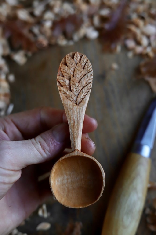 Entirely hand Carved by knife from some beautiful naturally fallen wild cherry wood that is a lovely golden colour