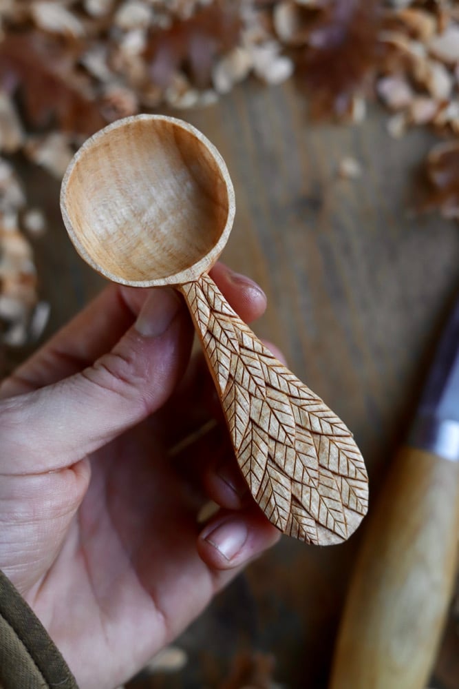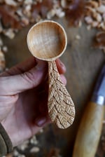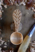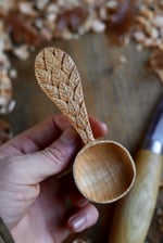 Entirely hand Carved by knife from some beautiful naturally fallen wild cherry wood that is a lovely golden colour
