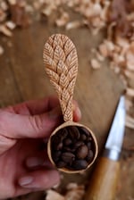 Entirely hand Carved by knife from some beautiful naturally fallen wild cherry wood that is a lovely golden colour