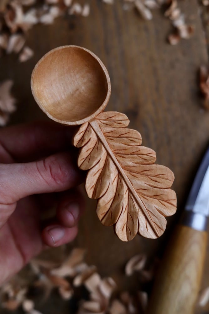 A beautifully delicate and highly detailed scoop inspired by the mighty Oak tree and modelled on a real oak leaf from a tree outside the carving workshop